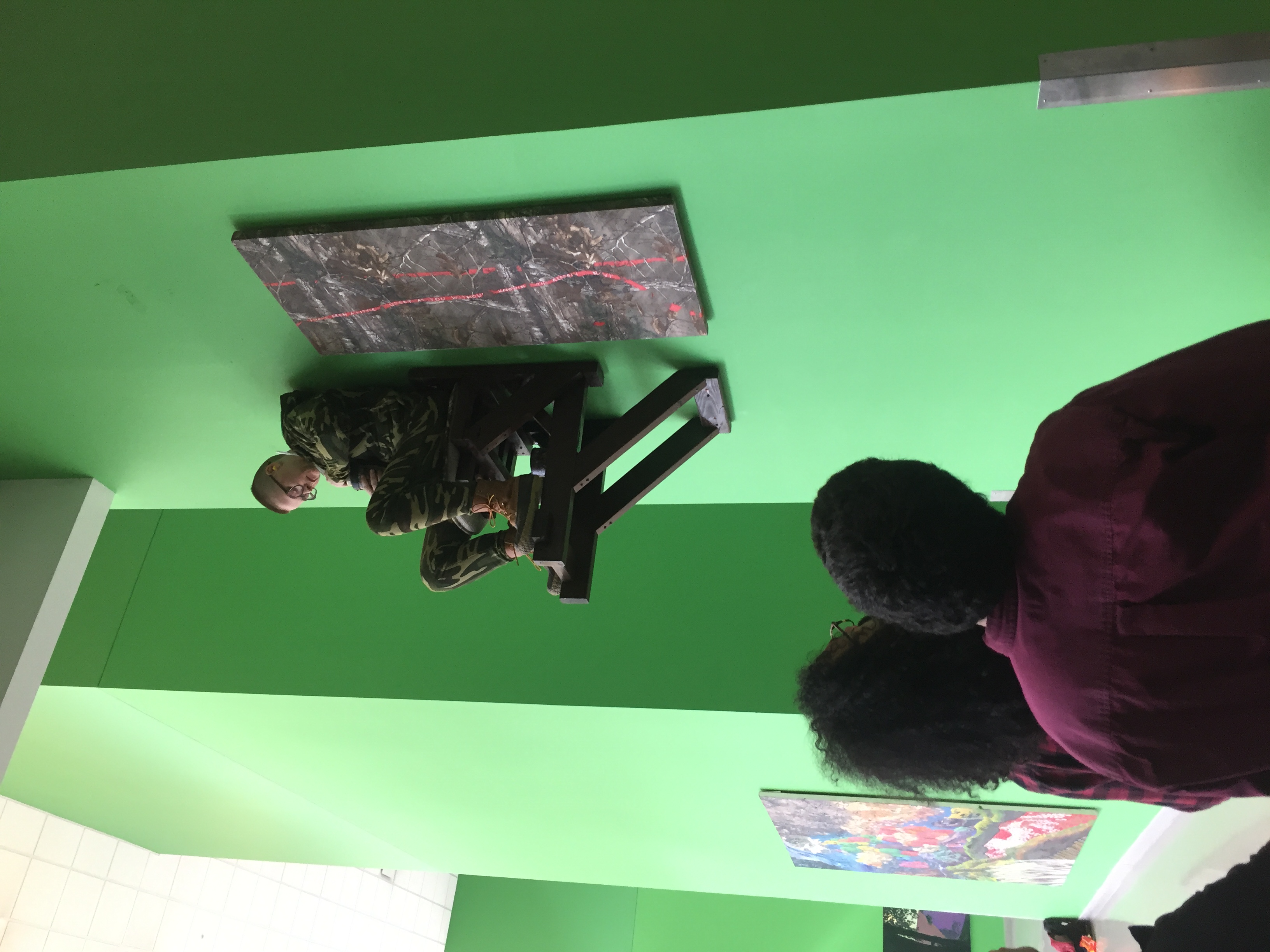 In 2016 I made a work where I drank a thermos of coffee sitting on a chair I built and installed on the wall in the main hallway at Tyler School of Art, next to a painting on RealTree fabric with words taken from a letter sent to me, wearing a hand sewn camouflage suit. Eventually, the objects from the performance were installed in the Painting department lobby in about 2017, where it then sat semi-permanently installed for 5 years.